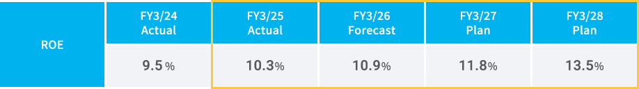 In FY3/28, which is the final year of the Fifth Medium-Term Management Plan, we are targeting ROE of 13.5% up from 10.3% in FY3/25, by promoting the significant issues in pursuit of the ¥50 billion Vision and mainly by improving the net income margin.