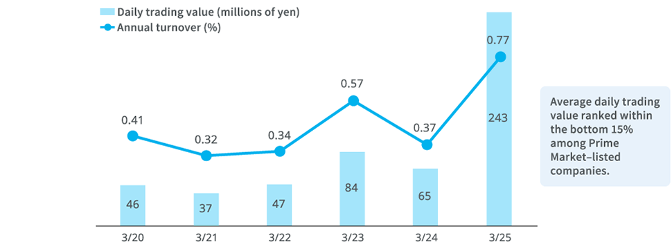 In FY3/25, we ranked in the top 59% of companies listed on the Tokyo Prime Market in terms of daily trading value (¥243 million) and annual turnover (0.77x).