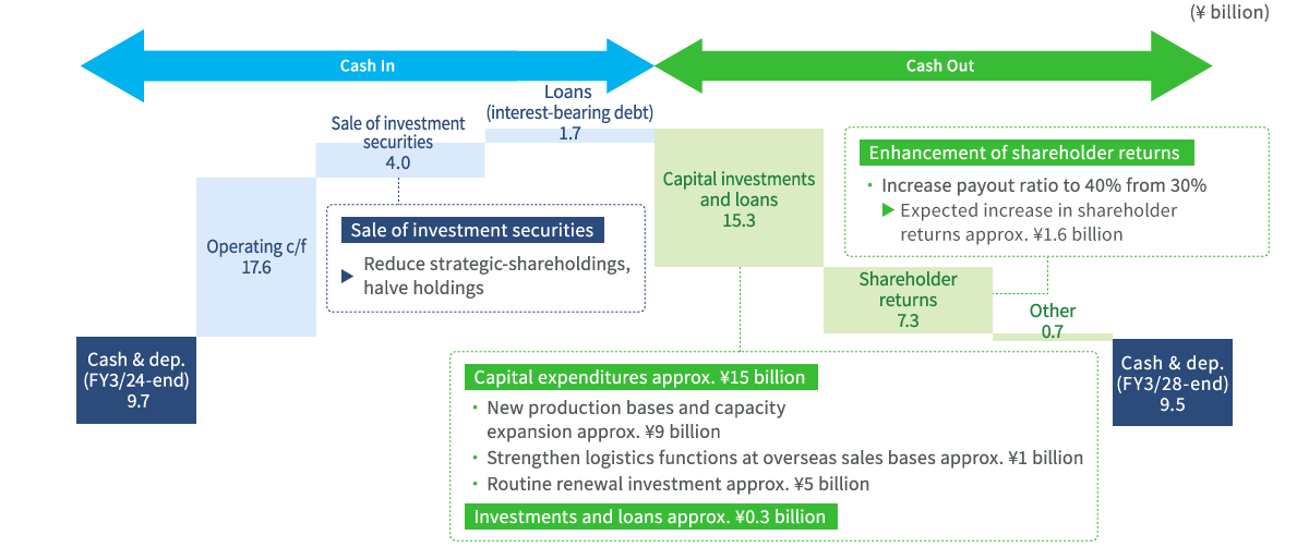 Against cash flows from operating activities of ¥17.6 billion during the Fifth Medium-Term Management Plan (FY3/25-28), we plan to make capital investments and loans of ¥15.3 billion and return ¥7.4 billion to shareholders.