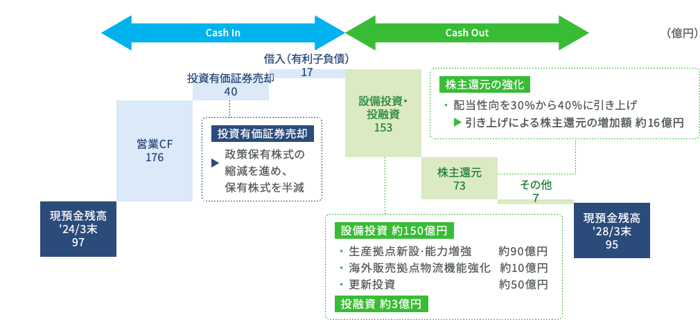 第五次中期経営計画期間(2025年3月期~2028年3月期)の営業キャッシュフロー176億円に対して、153億円の設備投資・投融資と74億円の株主還元を計画。