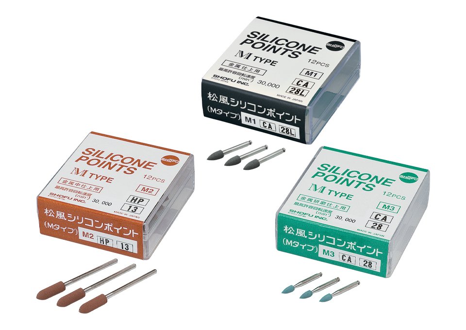 金合金、パラジウム合金などの仕上げ研磨用です。研磨力にすぐれており、M1(粗粒:黒)→M2(細粒:茶)→M3(微粒:緑)の順に研磨することにより、鏡面仕上げが可能となります。