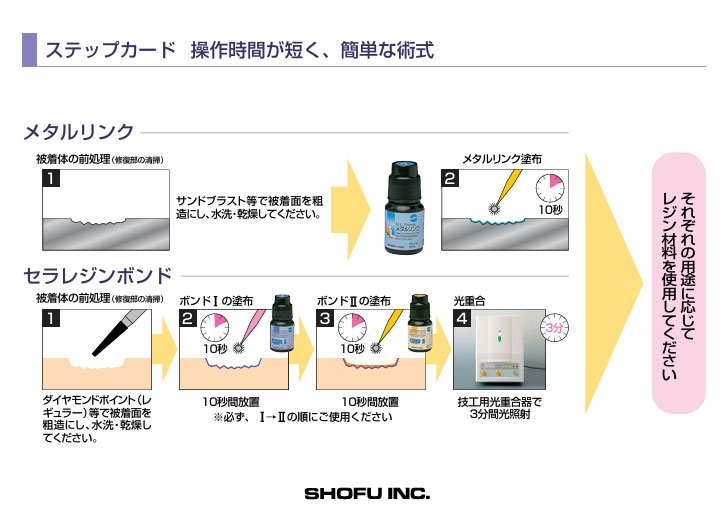 「ボンドⅠ」⇒「ボンドⅡ」の順にご使用いただくことにより、陶材・レジン全般とレジン材料の強固な接着が可能です。