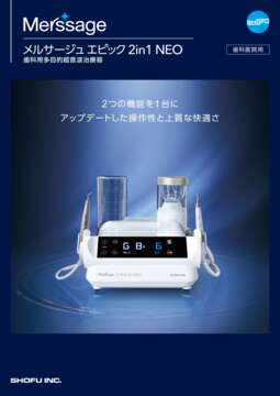 パウダーデバイスと超音波スケーラーの2つの機能を1台に搭載した歯科用多目的超音波治療器です。従来(メルサージュ エピック 2in1)より操作性と本体機能が向上しています。また、歯肉縁上のステインやプラーク・バイオフィルムを集中したパウダー噴射で、効率よく除去可能な新型ペリオジェットノズルを標準装備しています。