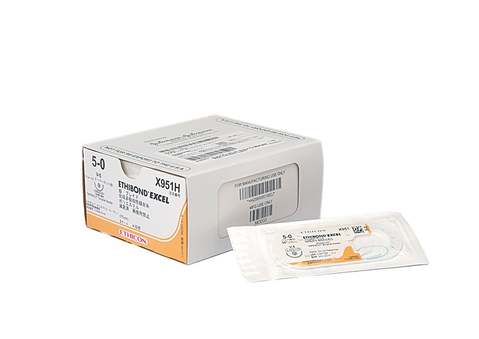 | X951H | エチボンド エクセル® | テーパーカット針 | 17 | 強彎(1/2) | 緑 | 75 | 5-0 | 36 |