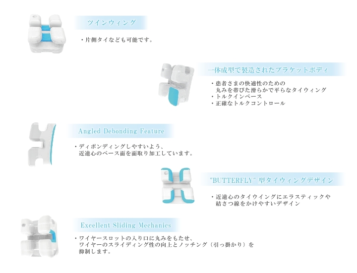 高度なインジェクションモールド技術で製造されており、高いブラケット強度と、歯の色を反映させて「調和」する美しさを持つブラケットです。