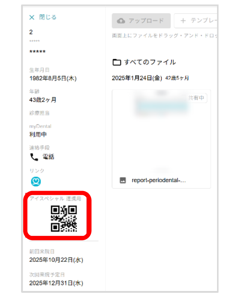 ジニー で患者を選択し、アイスペシャルC-Ⅱ , C-Ⅲ , C-Ⅳ , C-Ⅴ 専用のQRコードを表示します。
