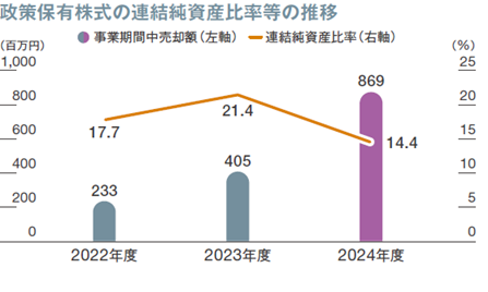 個々の政策保有株式については、取締役会で保有目的の適切性や、保有に伴う収益が資本コストに見合っているか等を具体的に精査し、保有の適否の検証を行っており、また、検証の結果、保有の意義や妥当性が希薄であると認められる政策保有株式については、相手先様への丁寧な説明に努め、縮減を図っていくことを方針としております。この方針に基づき、資本効率の向上と成長投資資金の確保の観点も踏まえ、計画的に政策保有株式の売却を進めることを決定し、第五次中期経営計画期間内(2028年3月31日まで)に4,000百万円を売却し、連結純資産に対する政策保有株式の比率を、現状の20%程度から10%程度まで引き下げることを計画しています。